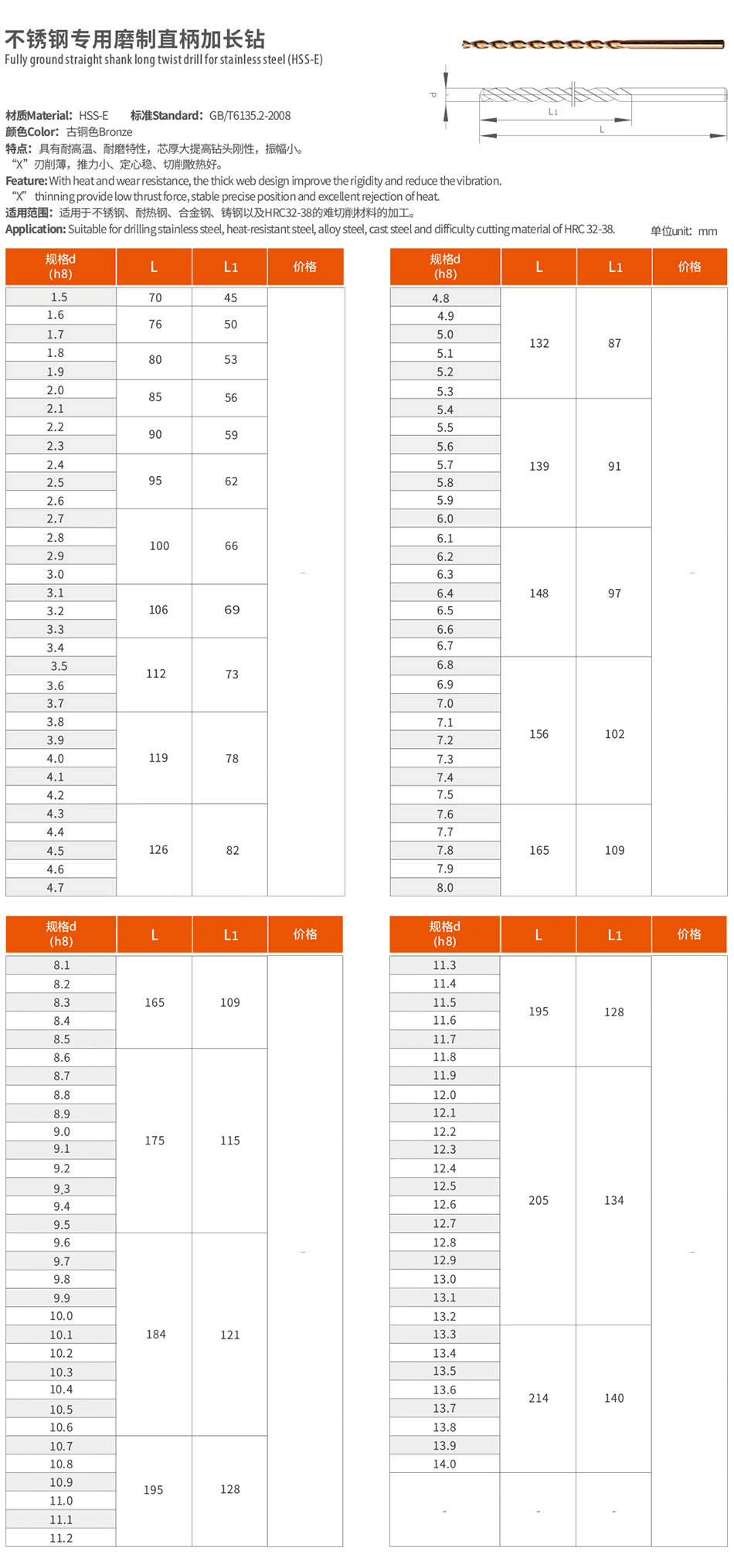 不銹鋼專用磨制直柄麻花鉆具有耐高溫、耐磨特性,芯厚大提高鉆頭剛性,振幅小。