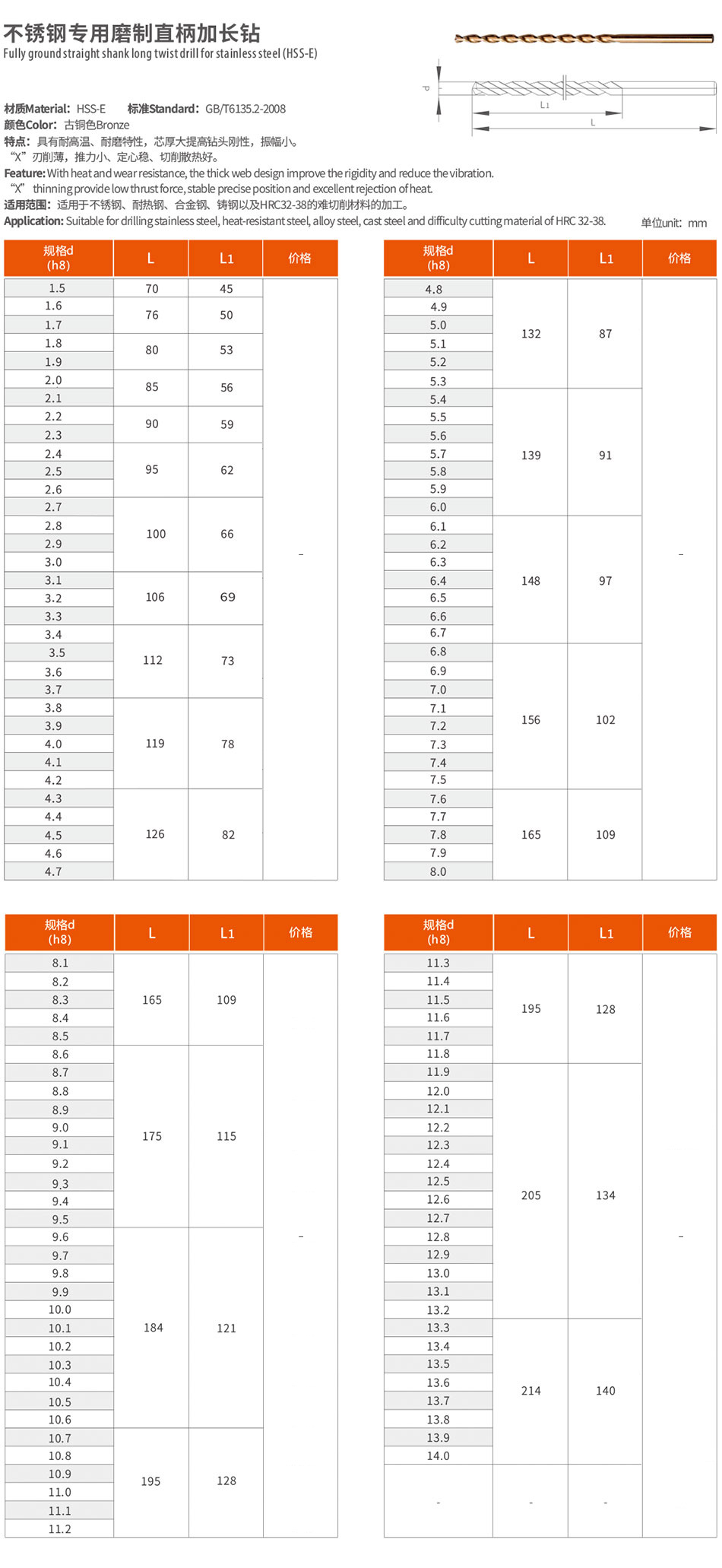 不銹鋼專用磨制直柄加長鉆具有耐高溫、耐磨特性,芯厚大提高鉆頭剛性,振幅小。