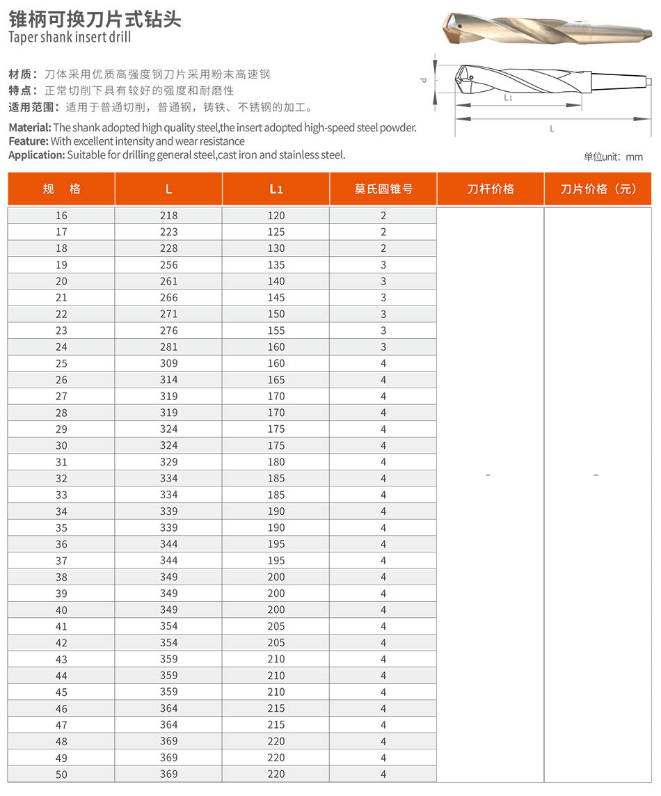 錐柄可換刀片式鉆頭,適用于普通切削,普通鋼,鑄鐵、不銹鋼的加工。