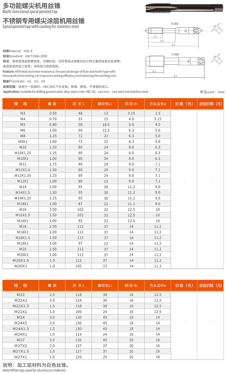 名稱:不銹鋼專用螺尖機用絲錐 材質: HSS-E 產地:中國 類別:工業倉