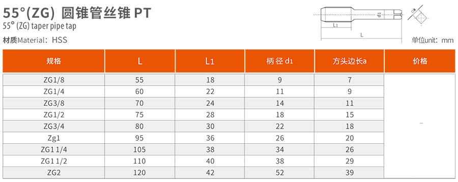 適用范圍:55°(ZG) 圓錐管絲錐 PT