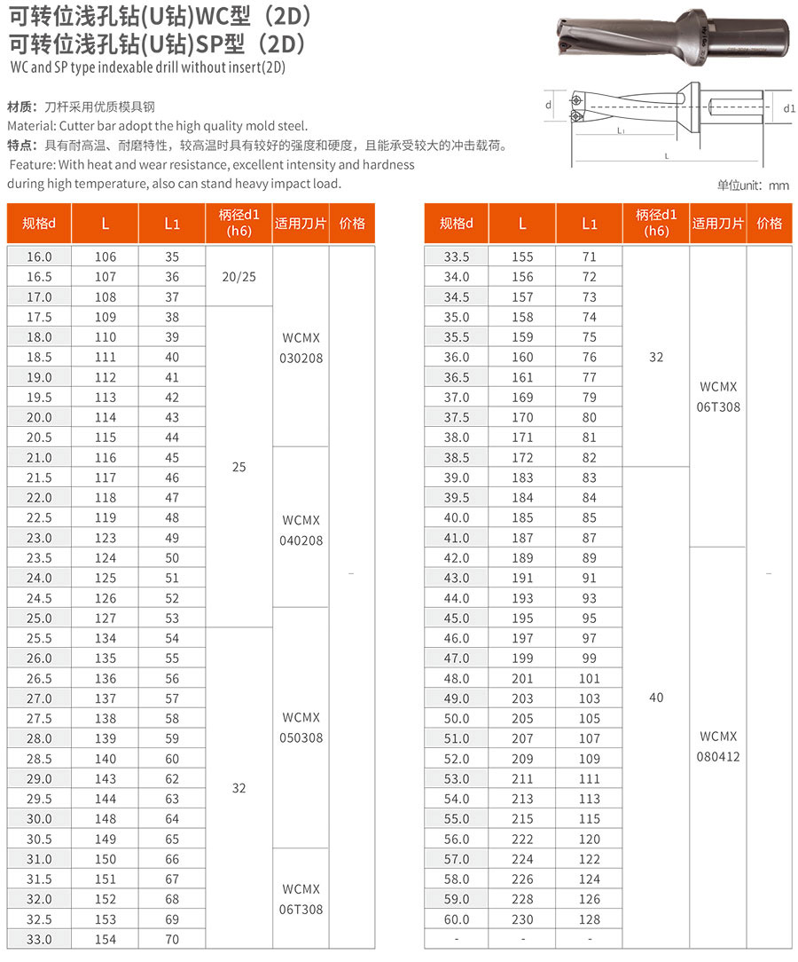 名稱:可轉位淺孔鉆(U鉆)WC型、SP型 (2D) 材質: 刀桿采用優質模具鋼 產地:中國 類別:工業倉