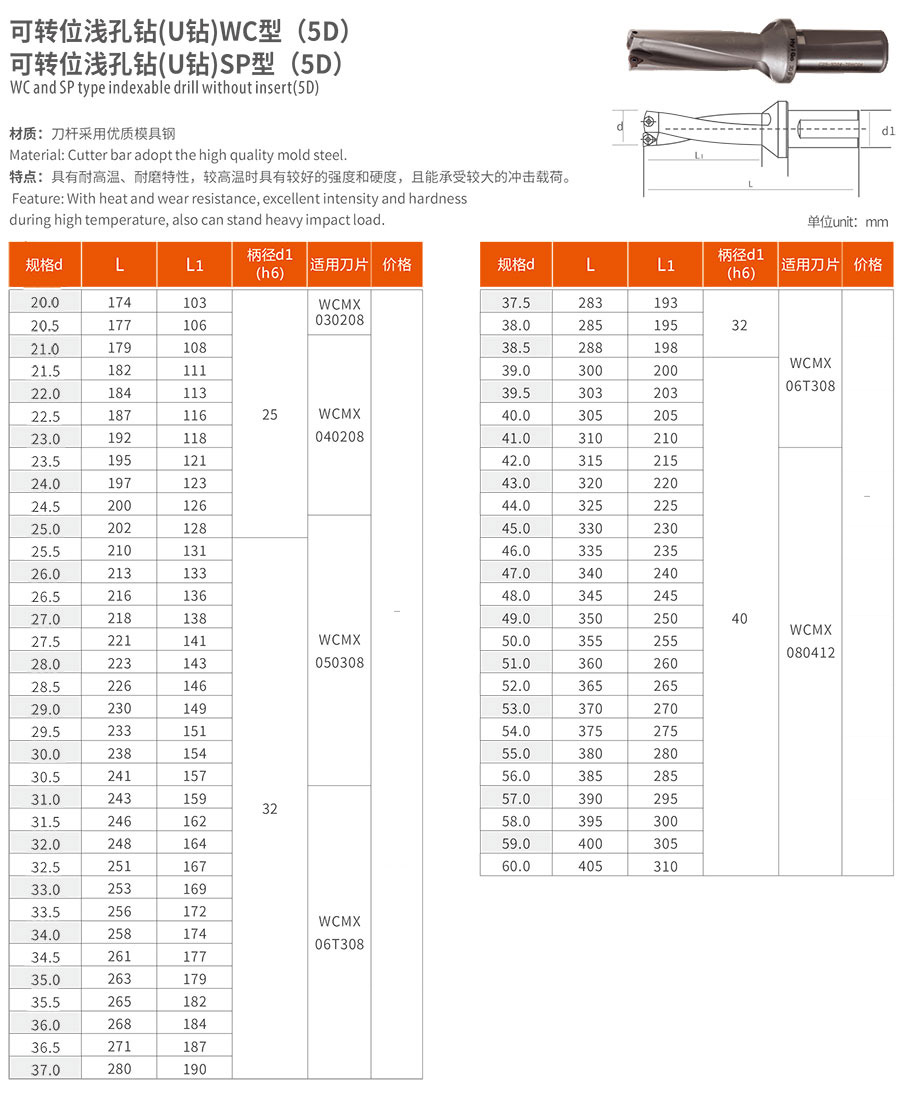 名稱:可轉位淺孔鉆(U鉆)WC型、SP型 (5D) 材質: 刀桿采用優質模具鋼 產地:中國 類別:工業倉