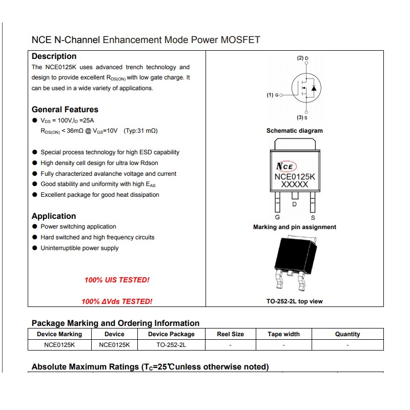 NCE0125K 100V 25A N溝道封裝TO252 MOSFET場效應管