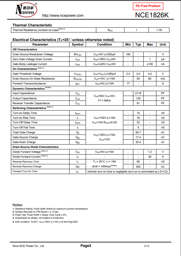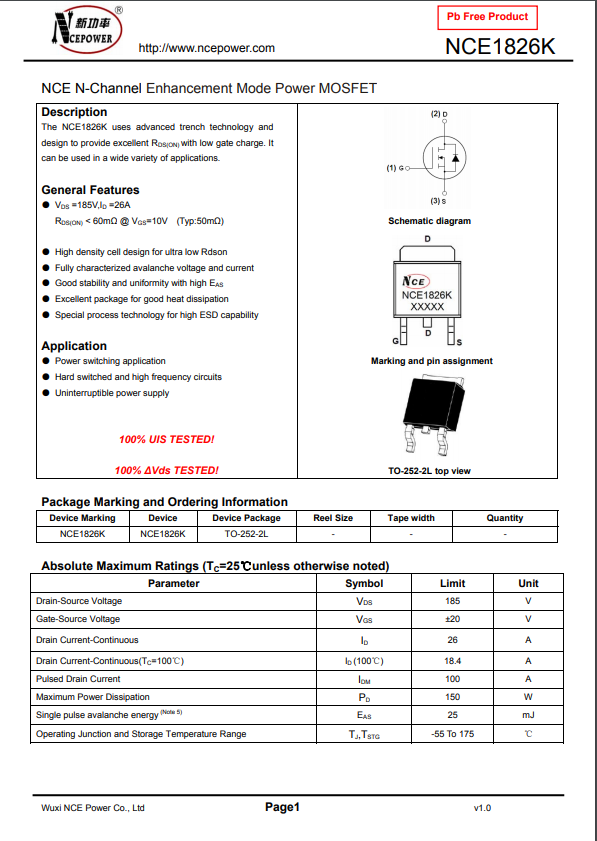 NCE1826K TO-252封裝 180V 10A N溝道MOS管
