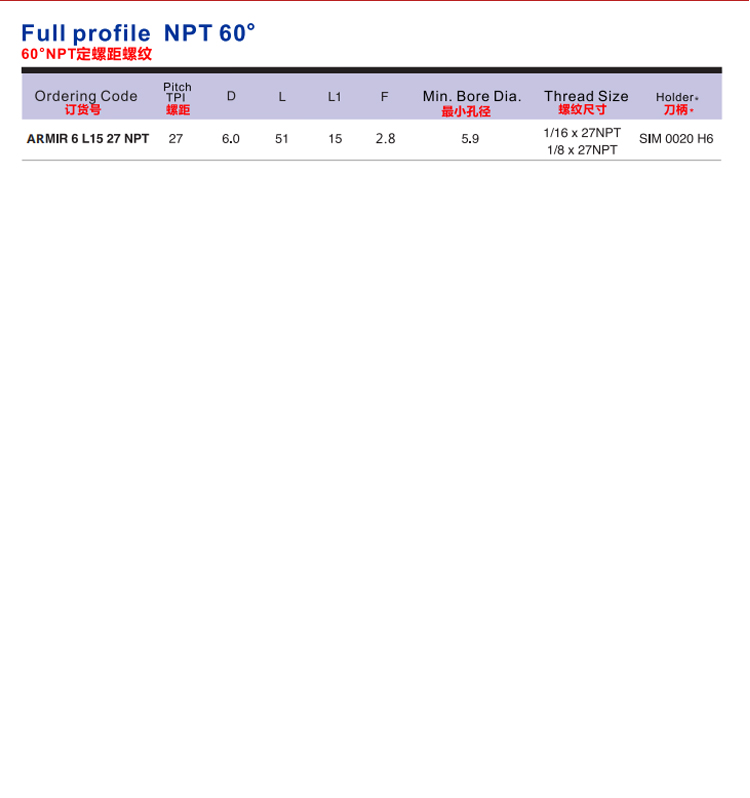 艾瑞德鏜孔刀 微型鏜刀/螺紋加工 帶內冷孔 60°NPT定螺距螺紋系列