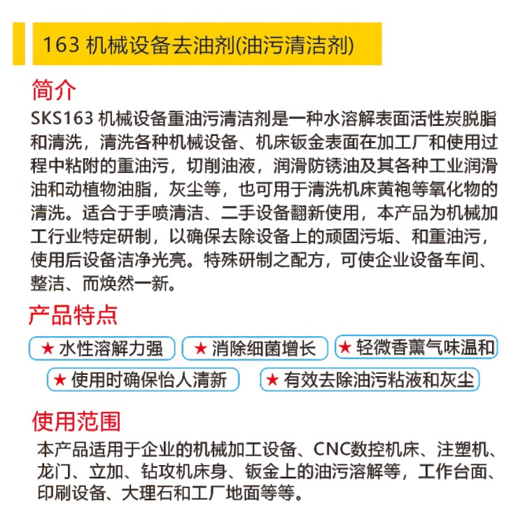 SKS 163機械設備去油劑(油污清潔劑)適用于機械加工設備、數控機床、注塑機鈑金上的油污溶解等