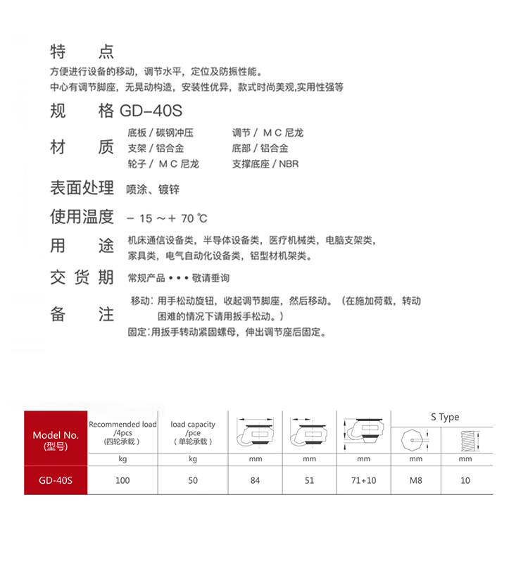 福馬腳輪GD-40S 用于機(jī)床通信設(shè)備類,半導(dǎo)體設(shè)備類,醫(yī)療機(jī)械類,電腦支架類,家具類,電氣自動(dòng)化設(shè)備類,鋁型材機(jī)架類