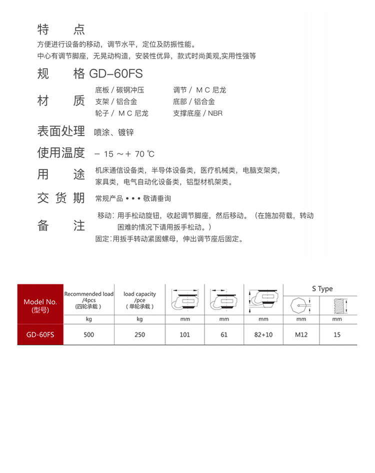 福馬腳輪GD-60FS用于機床通信設備類,半導體設備類,醫療機械類,電腦支架類,家具類,電氣自動化設備類,鋁型材機架類
