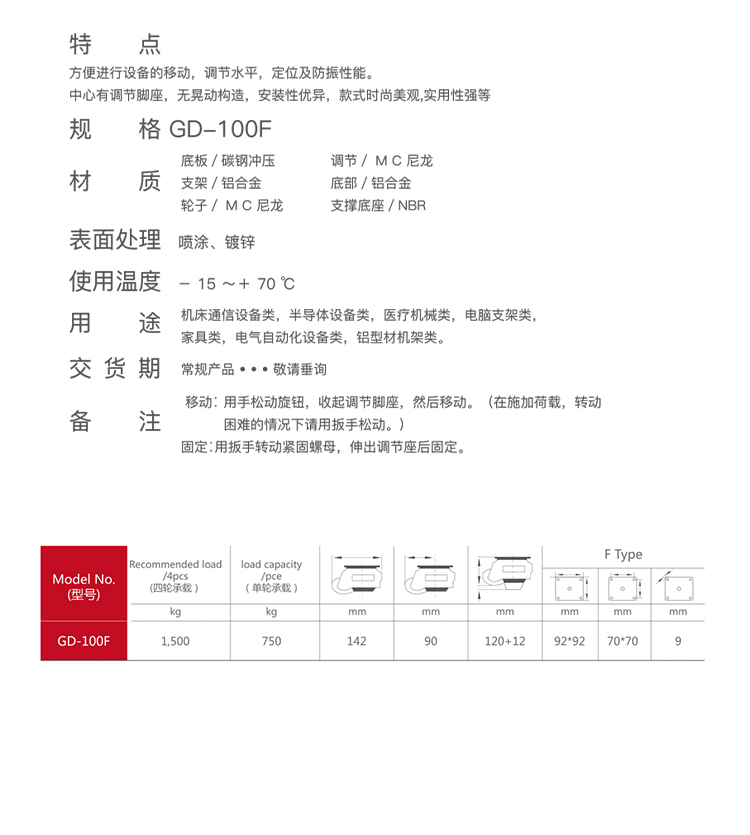 福馬腳輪GD-100F用于機床通信設備類,半導體設備類,醫療機械類,電腦支架類,家具類,電氣自動化設備類,鋁型材機架類