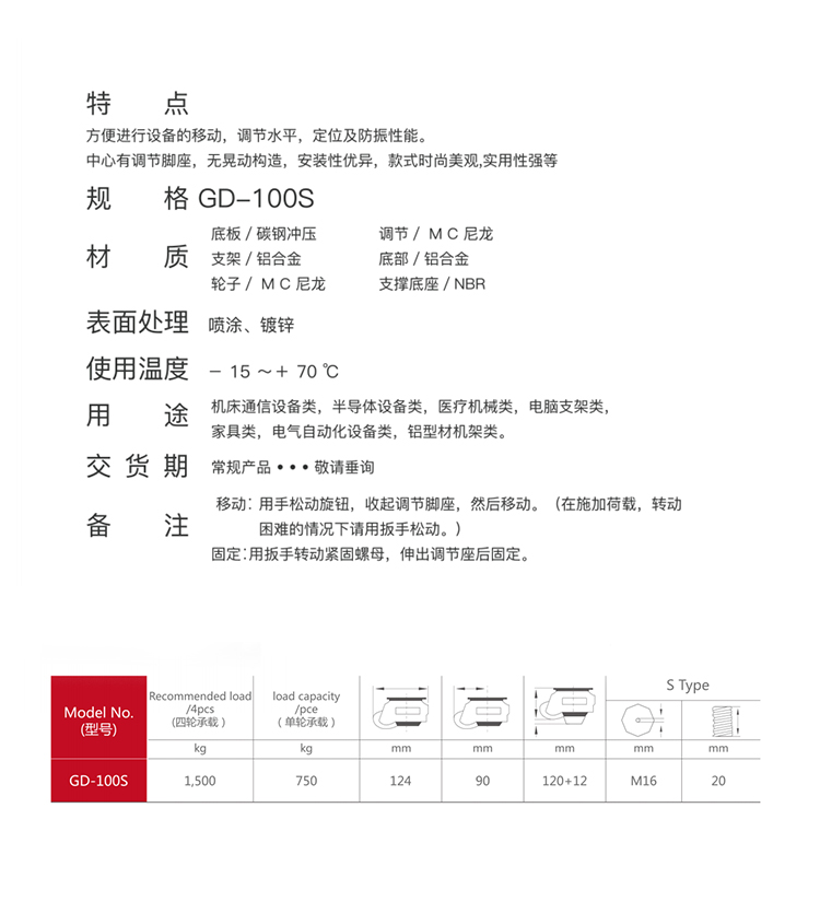 福馬腳輪GD-100S用于機床通信設備類,半導體設備類,醫療機械類,電腦支架類,家具類,電氣自動化設備類,鋁型材機架類